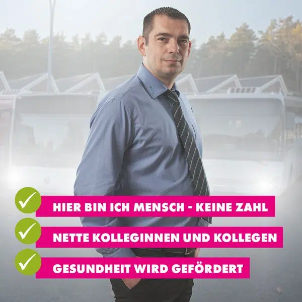 Die wöchentliche Arbeitszeit beträgt 39 Stunden. Du arbeitest im Schichtdienst, auch am Wochenende und an Feiertagen. Alle Überstunden werden von uns mit Zuschlag bezahlt. Zusätzlich gibt es Zuschläge für Nacht-, Sonntags- und Feiertagsarbeit und eine Prämie für eine ökologische Fahrweise.